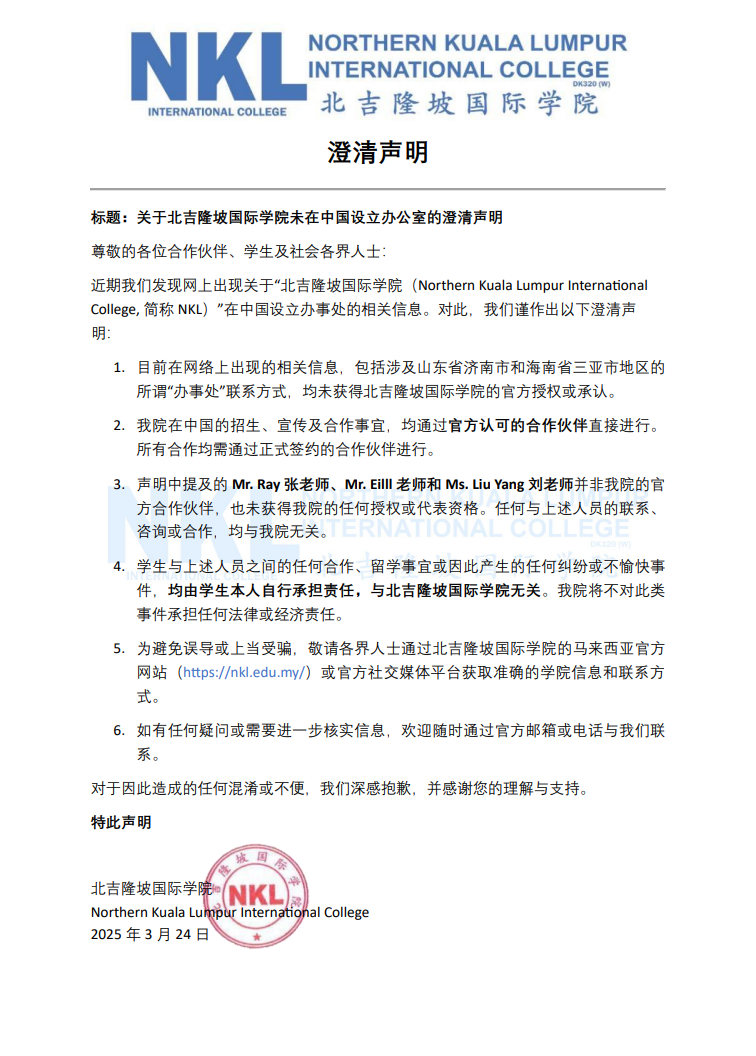 近期我们发现网上出现关于“北吉隆坡国际学院(Northern Kuala Lumpur InternationalCollege, 简称 NKL)”在中国设立办事处的相关信息。对此,我们谨作出以下澄清声